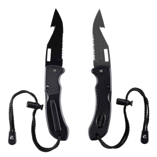 The wrist strap ensures secure access during dives adding an extra safety layer. Available in dual serrated and smooth blade options this compact and streamlined knife offers efficient manoeuvrability without sacrificing power.