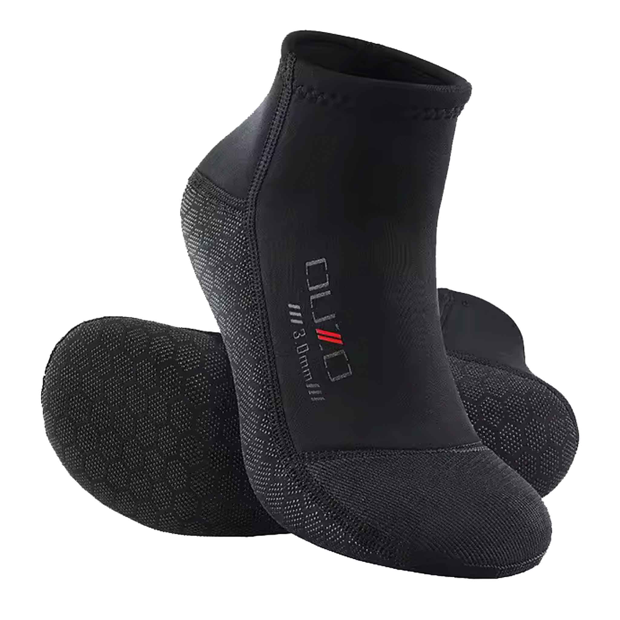The HQ Diving Tough 3mm Shorty Fin Socks provide Ultra Comfort with herringbone curled edges and wear resistant CR fabric for toe tips. This Tough sock is stitched with four needles and six threads providing durability for years to come. Easier to put on than traditional neoprene socks and won’t ride down while kicking or having larger calf muscles.