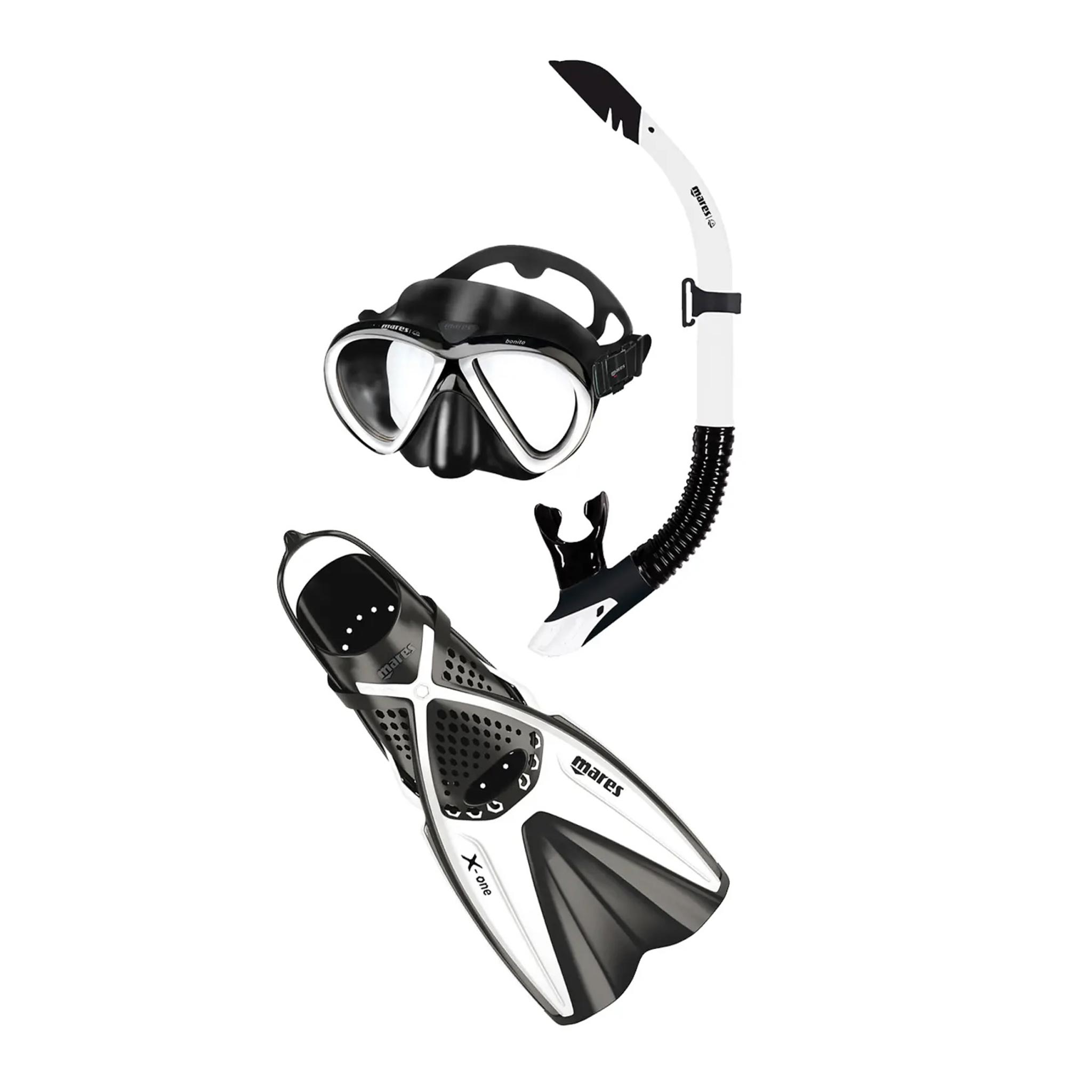 The Mares X-One Bonito Snorkelling Set is a great Mask, Snorkel and Fin set for the scuba diver or snorkeler , with a mask featuring dual, optimally shaped reverse teardrop lenses, a splash top snorkel with easy exhale purge valve and soft silicone mouthpiece and Bare-foot, open heel fins with Riddled Foot Pocket reduces the parachute effect for easier kicking action.