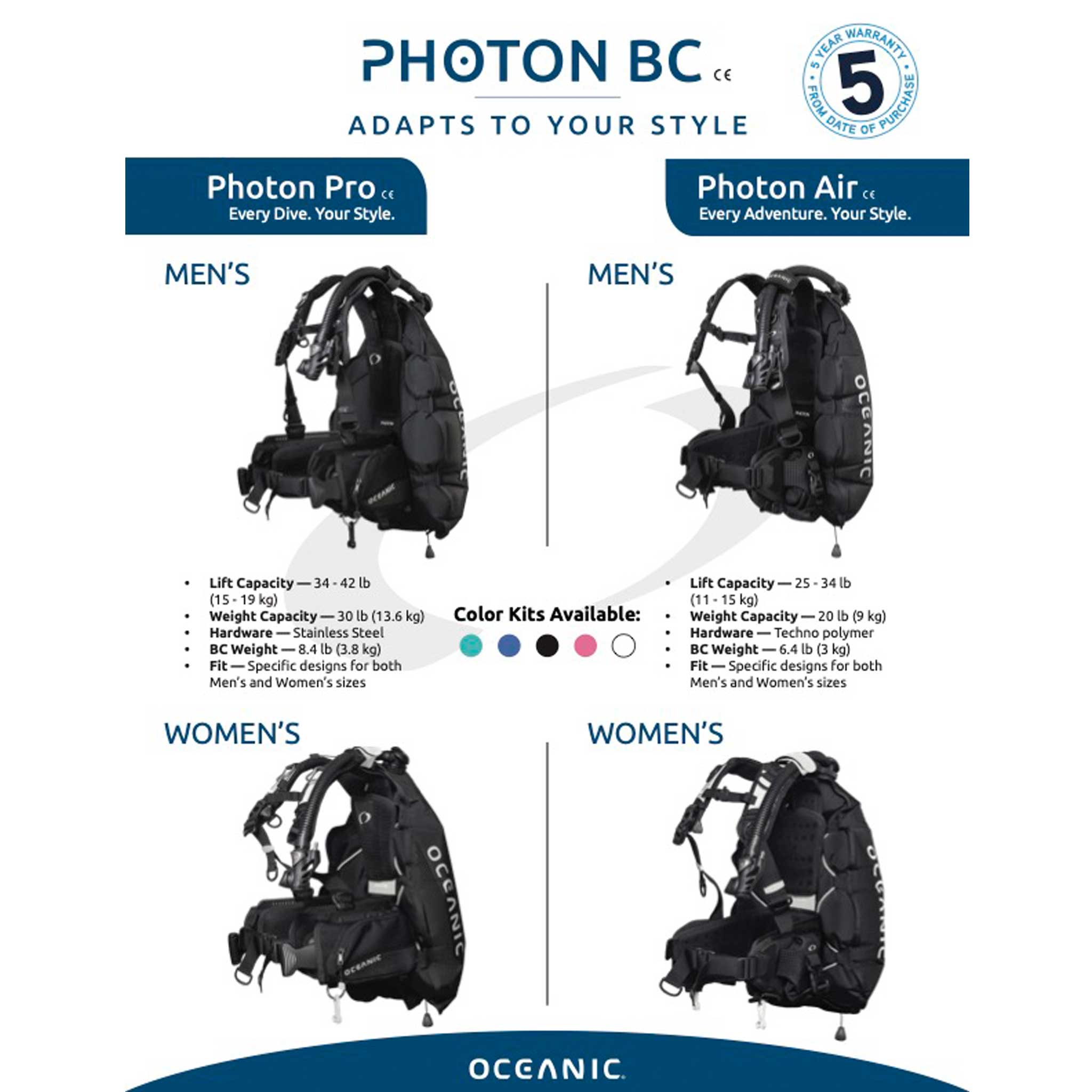 - Platform-free designed for accessorizing — Customize your perfect BC with the Oceanic Photon accessories such as the Dive Housing Holster, Utility Pocket, TankTamer stainless quick adjust tank band, and a wide range of color kits to match your style.